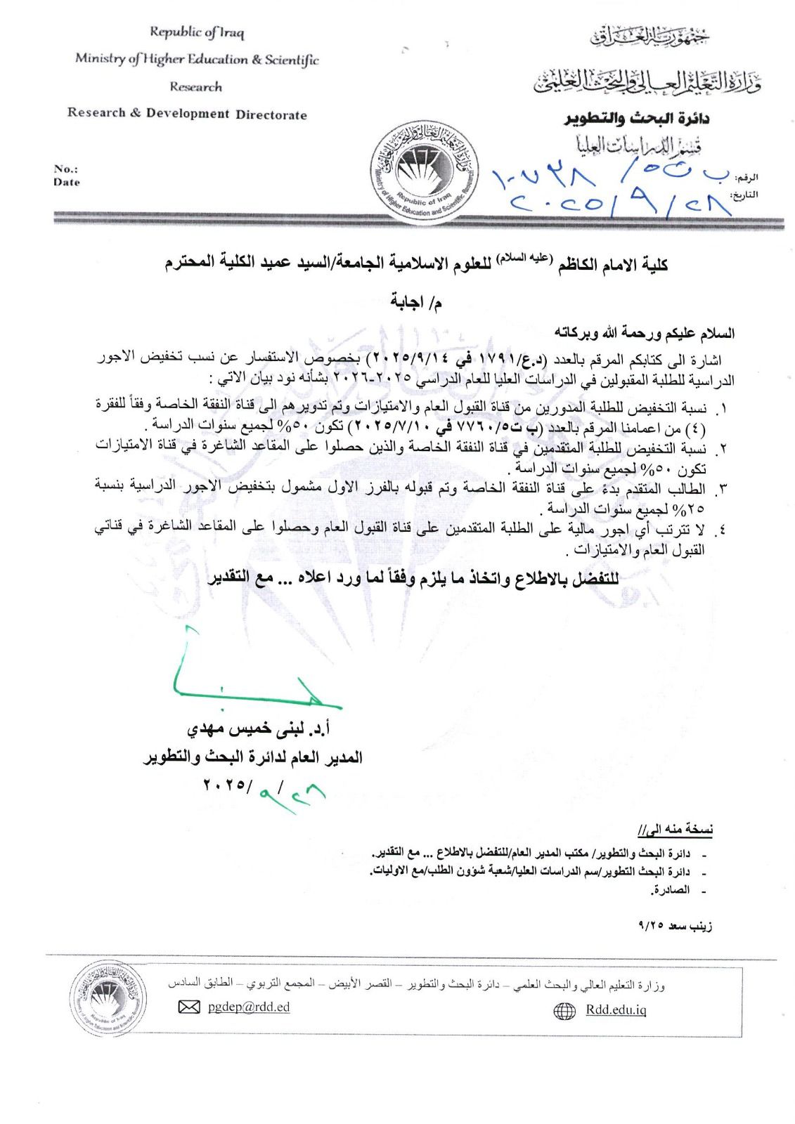 اعمام تخفيض اجور الدراسة للمرقنه قيودهم 2025-2026: لتحميل الملف اضغط هنا